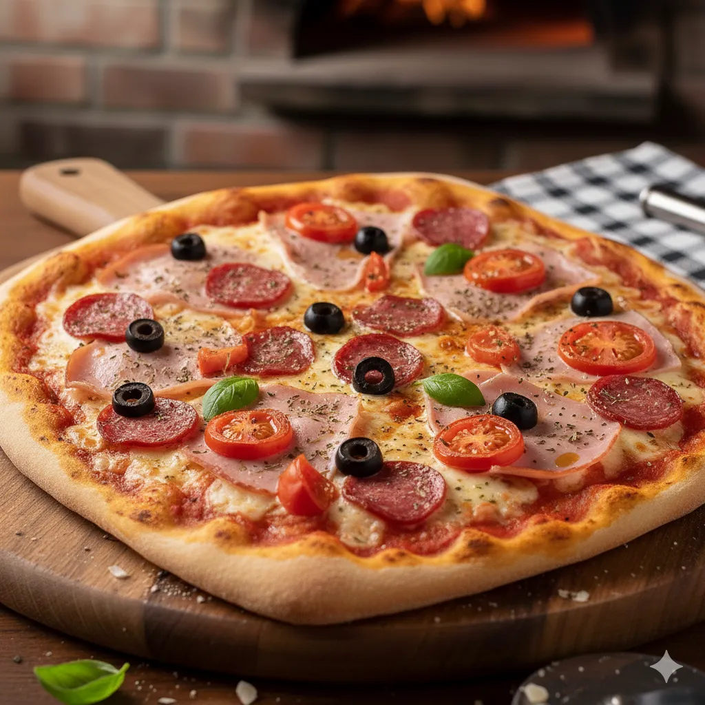 Sabor intenso y tradicional. Mozzarella, jamón pierna, aceitunas, salami y tomate.
